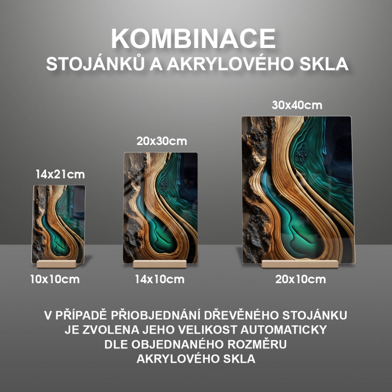 Na produktovém fotu vyobrazena nejoblíbenější varianta akrylového skla 14x21/21x14cm a dřevěný stojánek 10x10cm.