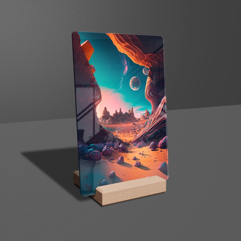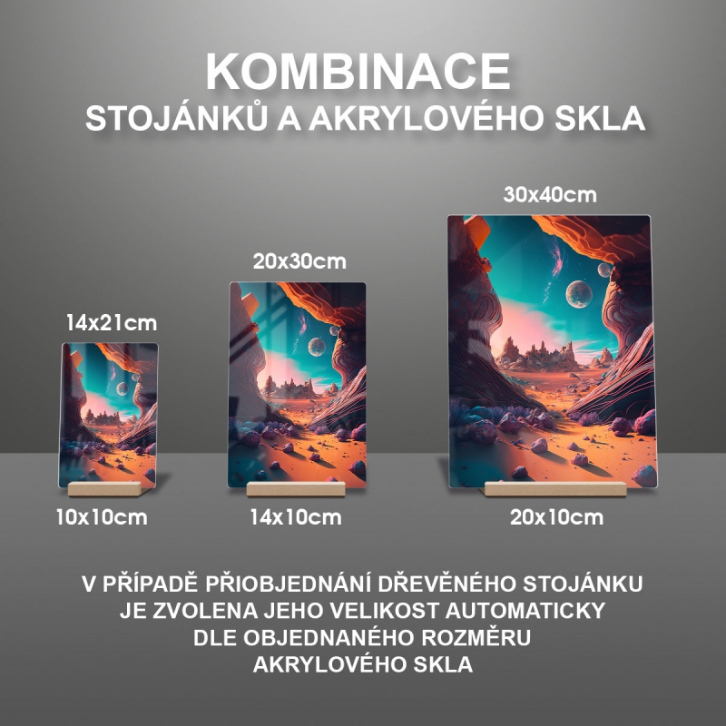 Na produktovém fotu vyobrazena nejoblíbenější varianta akrylového skla 14x21/21x14cm a dřevěný stojánek 10x10cm.