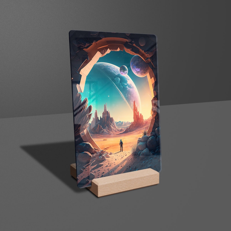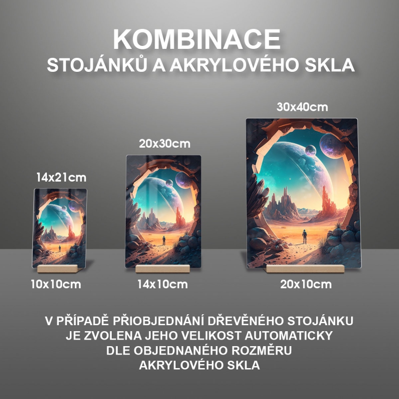 Na produktovém fotu vyobrazena nejoblíbenější varianta akrylového skla 14x21/21x14cm a dřevěný stojánek 10x10cm.