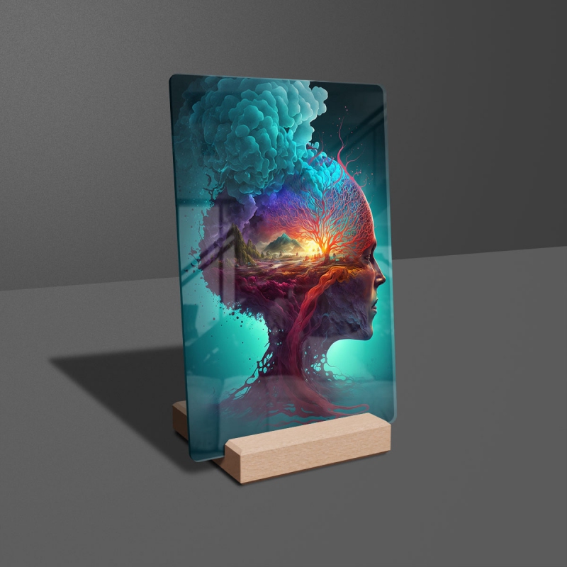 Na produktovém fotu vyobrazena nejoblíbenější varianta akrylového skla 14x21/21x14cm a dřevěný stojánek 10x10cm.