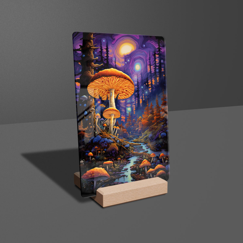 Na produktovém fotu vyobrazena nejoblíbenější varianta akrylového skla 14x21/21x14cm a dřevěný stojánek 10x10cm.