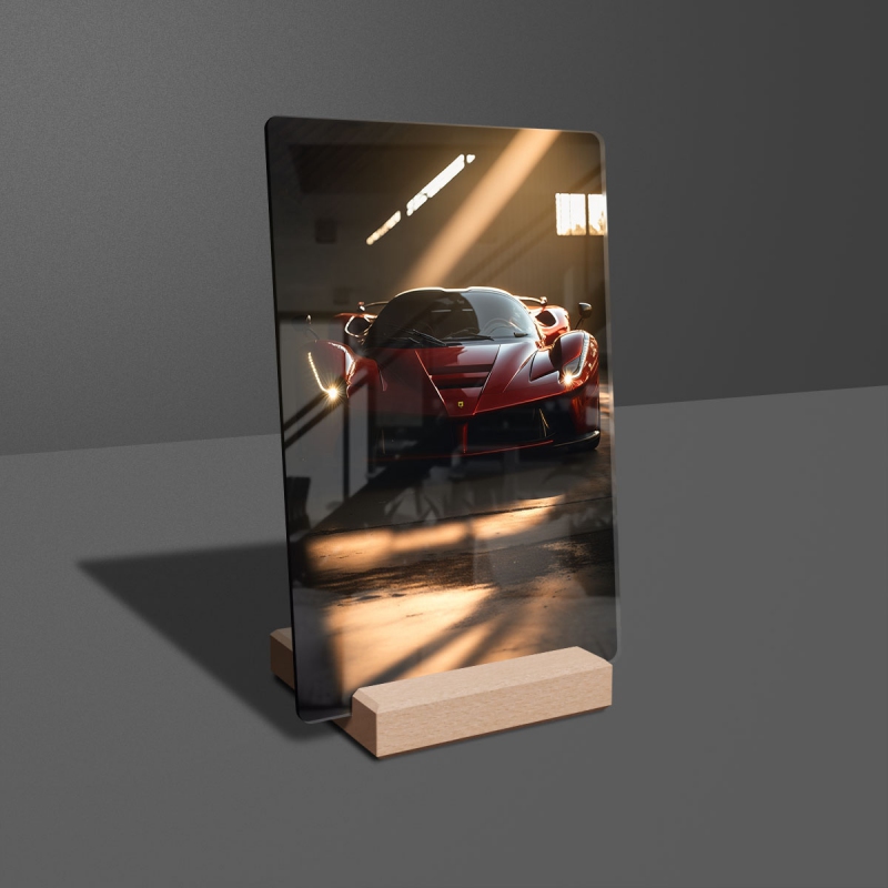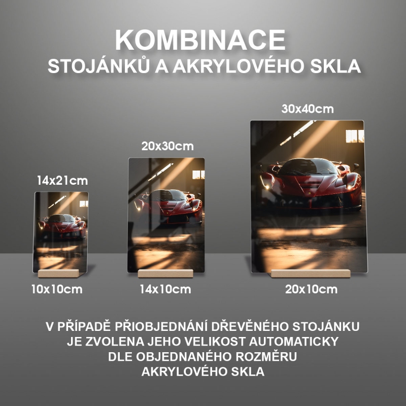 Na produktovém fotu vyobrazena nejoblíbenější varianta akrylového skla 14x21/21x14cm a dřevěný stojánek 10x10cm.