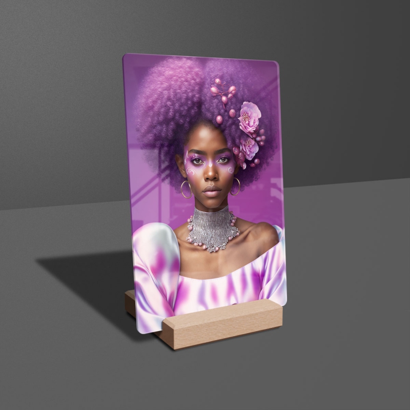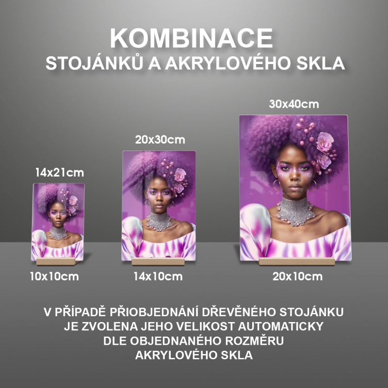 Na produktovém fotu vyobrazena nejoblíbenější varianta akrylového skla 14x21/21x14cm a dřevěný stojánek 10x10cm.