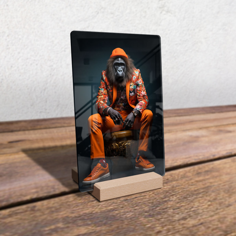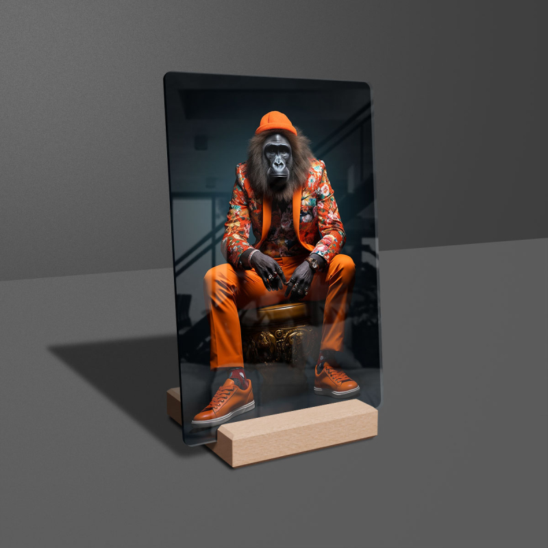 Akrylové sklo gorila v oranžovém květinovém obleku