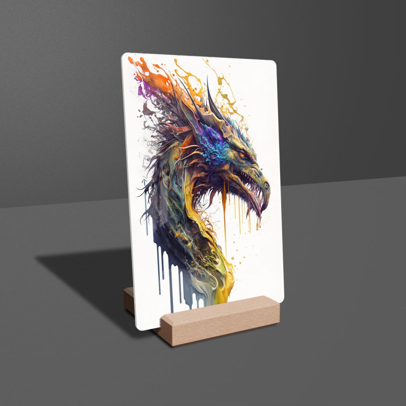 Na produktovém fotu vyobrazena nejoblíbenější varianta akrylového skla 14x21/21x14cm a dřevěný stojánek 10x10cm.