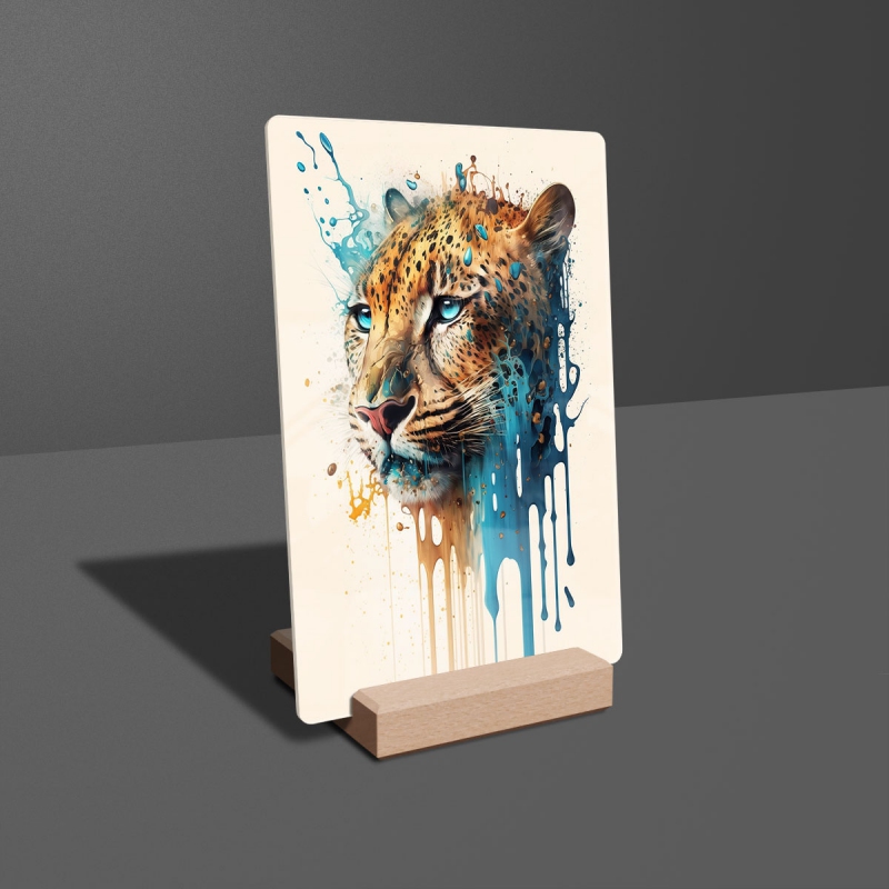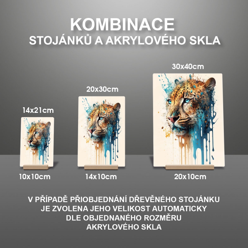 Na produktovém fotu vyobrazena nejoblíbenější varianta akrylového skla 14x21/21x14cm a dřevěný stojánek 10x10cm.