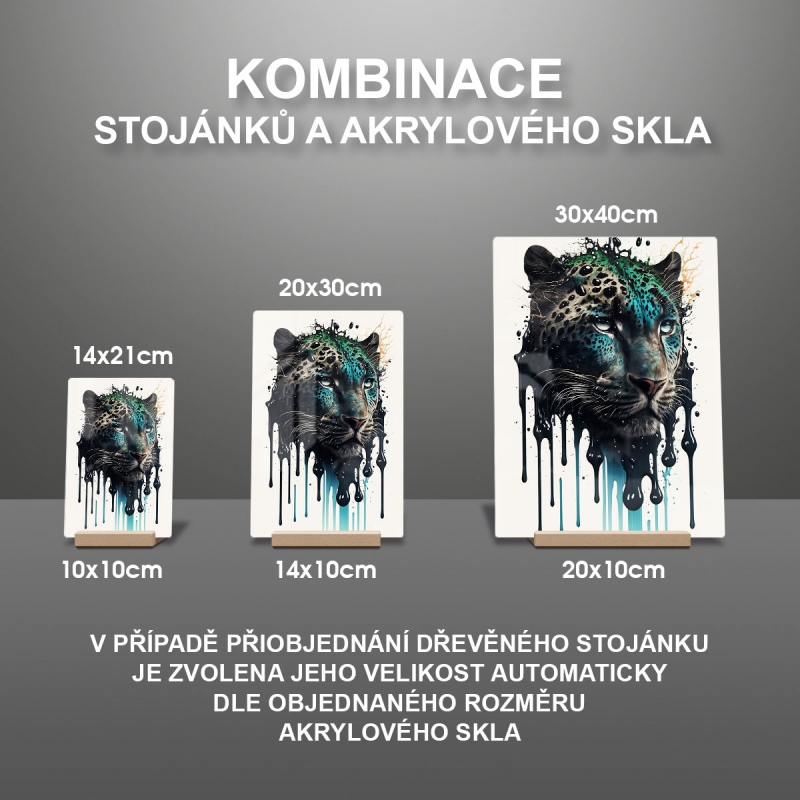 Na produktovém fotu vyobrazena nejoblíbenější varianta akrylového skla 14x21/21x14cm a dřevěný stojánek 10x10cm.
