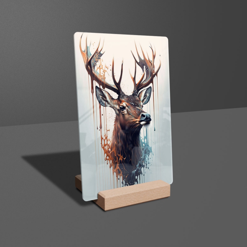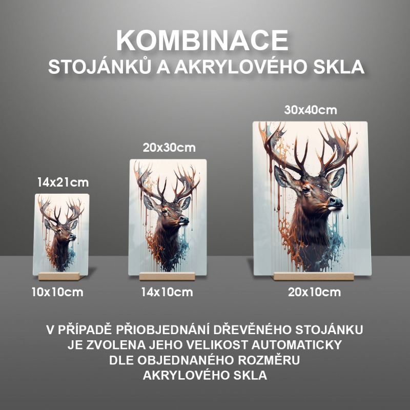 Na produktovém fotu vyobrazena nejoblíbenější varianta akrylového skla 14x21/21x14cm a dřevěný stojánek 10x10cm.