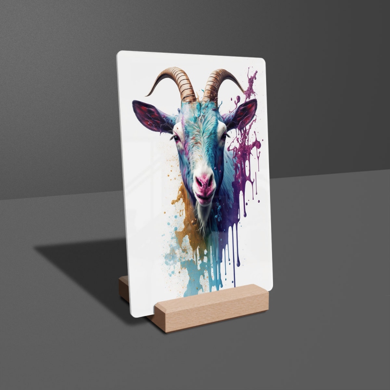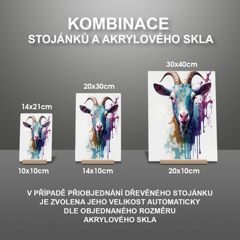 Na produktovém fotu vyobrazena nejoblíbenější varianta akrylového skla 14x21/21x14cm a dřevěný stojánek 10x10cm.