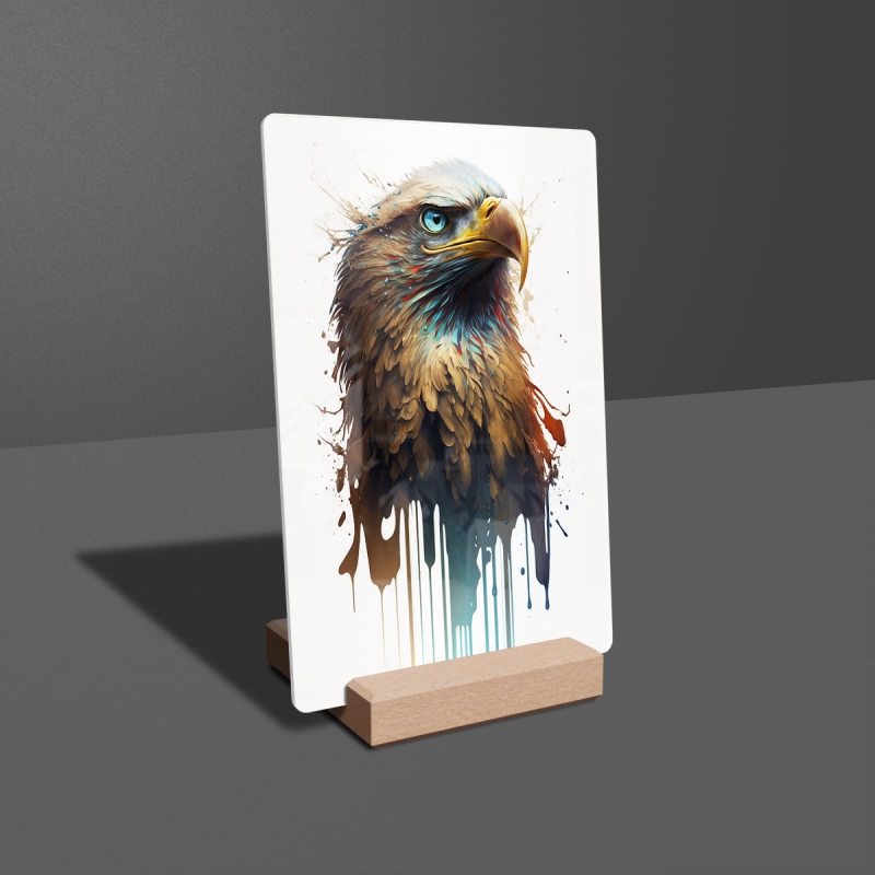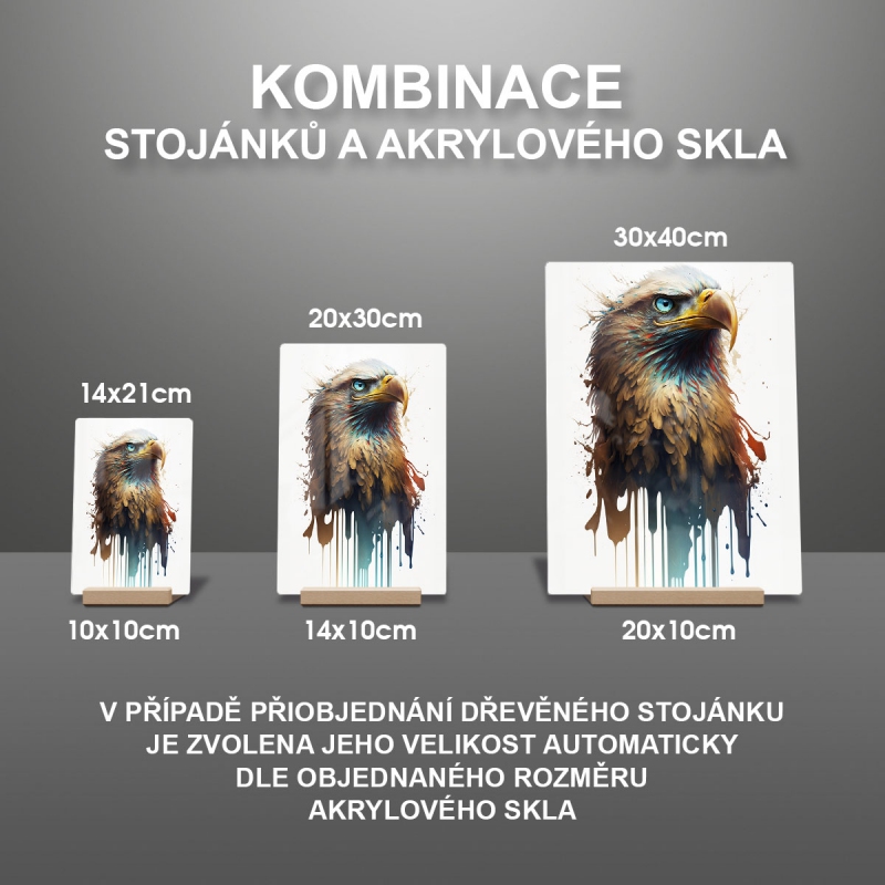 Na produktovém fotu vyobrazena nejoblíbenější varianta akrylového skla 14x21/21x14cm a dřevěný stojánek 10x10cm.