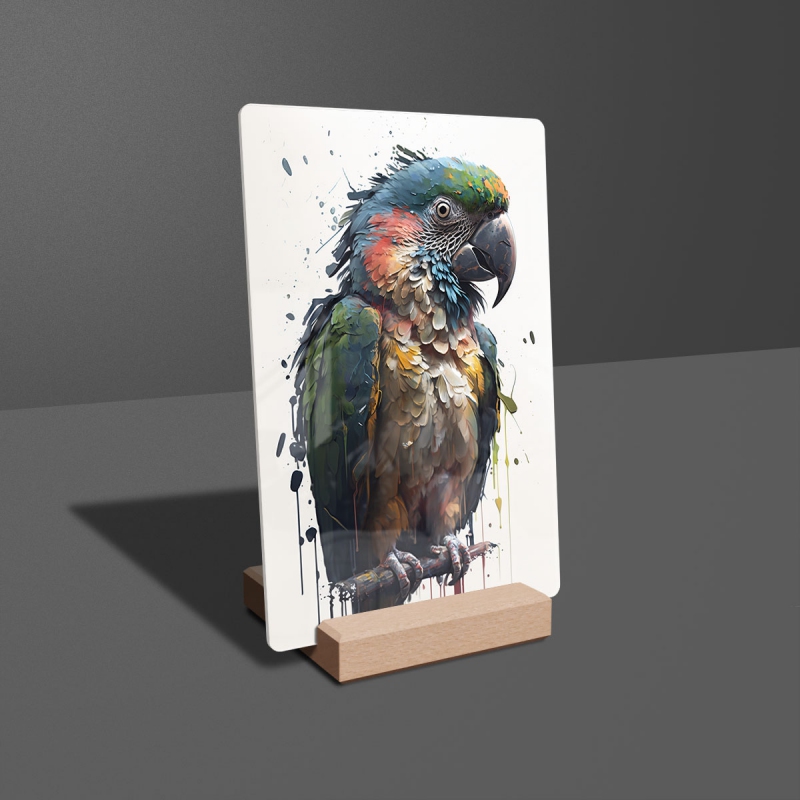 Na produktovém fotu vyobrazena nejoblíbenější varianta akrylového skla 14x21/21x14cm a dřevěný stojánek 10x10cm.