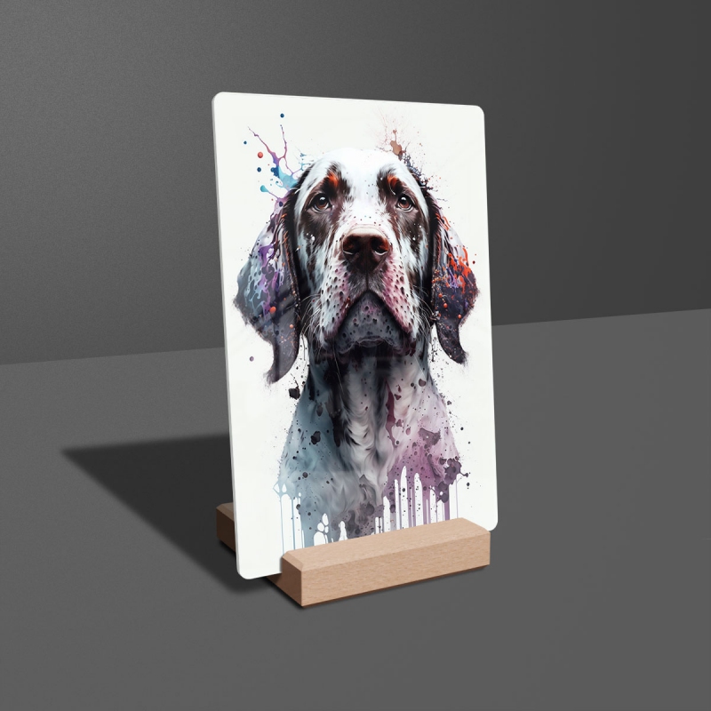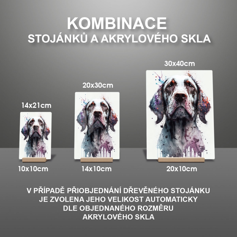 Na produktovém fotu vyobrazena nejoblíbenější varianta akrylového skla 14x21/21x14cm a dřevěný stojánek 10x10cm.