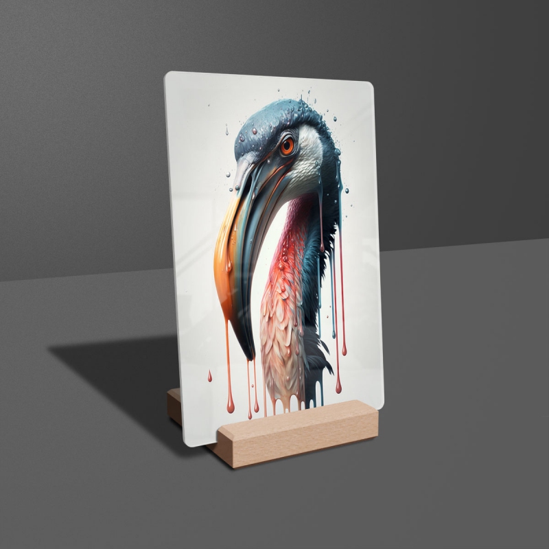 Na produktovém fotu vyobrazena nejoblíbenější varianta akrylového skla 14x21/21x14cm a dřevěný stojánek 10x10cm.