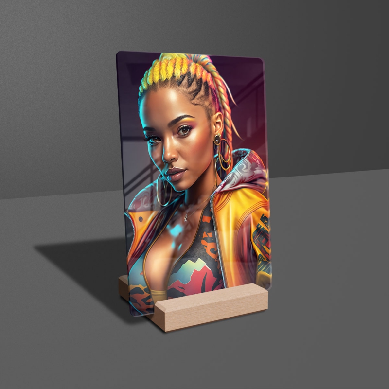 Na produktovém fotu vyobrazena nejoblíbenější varianta akrylového skla 14x21/21x14cm a dřevěný stojánek 10x10cm.