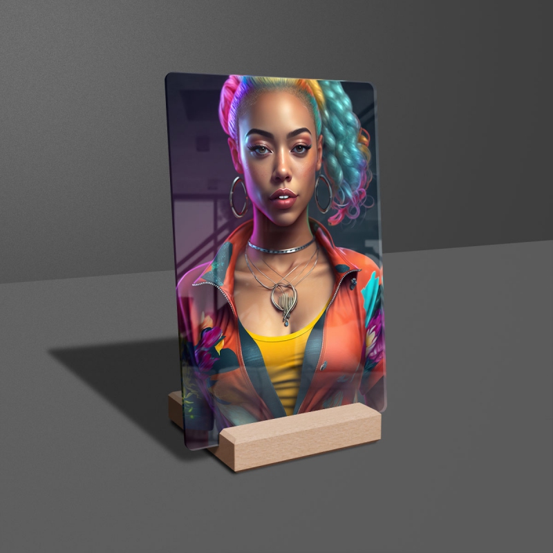 Na produktovém fotu vyobrazena nejoblíbenější varianta akrylového skla 14x21/21x14cm a dřevěný stojánek 10x10cm.