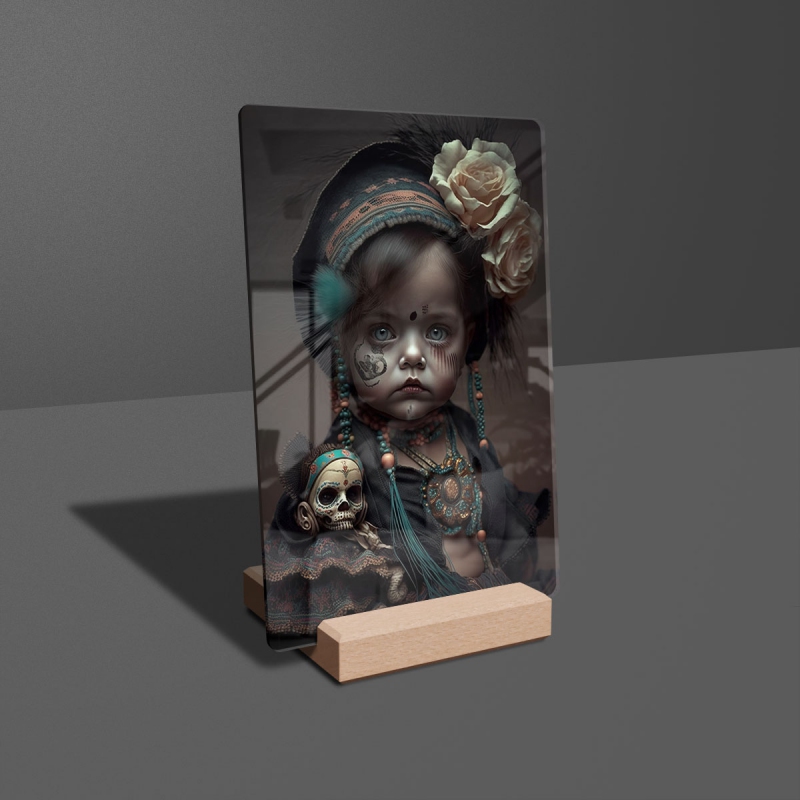 Na produktovém fotu vyobrazena nejoblíbenější varianta akrylového skla 14x21/21x14cm a dřevěný stojánek 10x10cm.