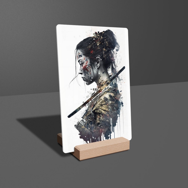 Na produktovém fotu vyobrazena nejoblíbenější varianta akrylového skla 14x21/21x14cm a dřevěný stojánek 10x10cm.