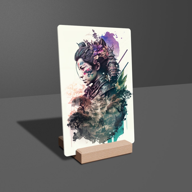 Na produktovém fotu vyobrazena nejoblíbenější varianta akrylového skla 14x21/21x14cm a dřevěný stojánek 10x10cm.