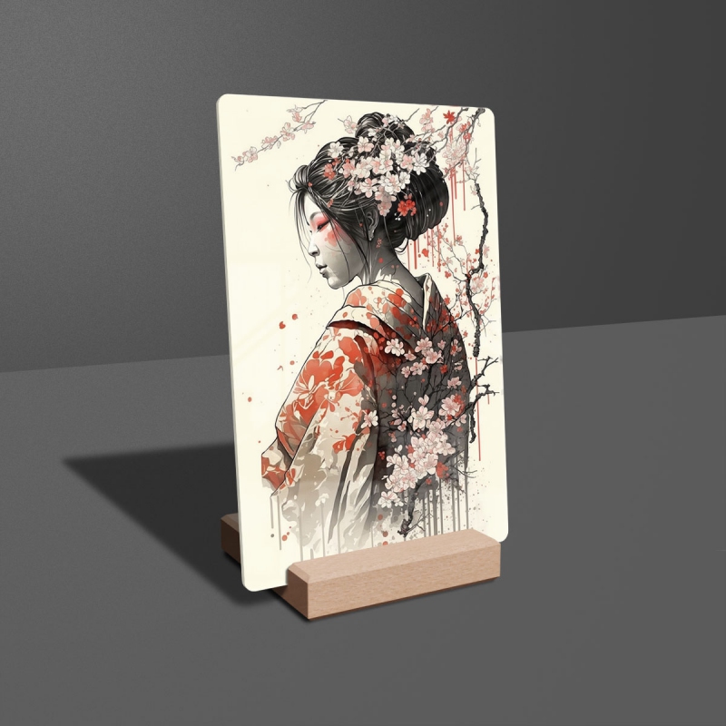 Na produktovém fotu vyobrazena nejoblíbenější varianta akrylového skla 14x21/21x14cm a dřevěný stojánek 10x10cm.