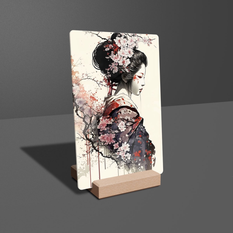 Na produktovém fotu vyobrazena nejoblíbenější varianta akrylového skla 14x21/21x14cm a dřevěný stojánek 10x10cm.