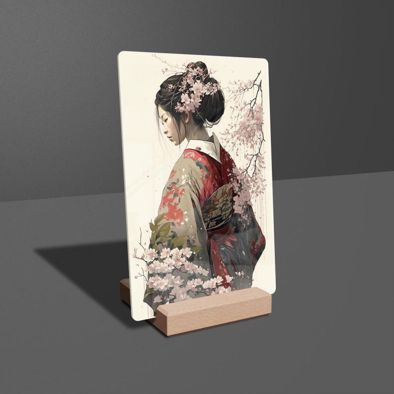 Na produktovém fotu vyobrazena nejoblíbenější varianta akrylového skla 14x21/21x14cm a dřevěný stojánek 10x10cm.