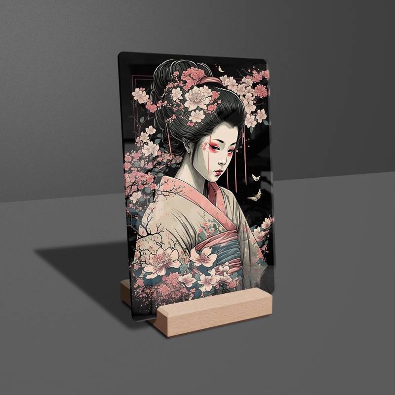 Na produktovém fotu vyobrazena nejoblíbenější varianta akrylového skla 14x21/21x14cm a dřevěný stojánek 10x10cm.