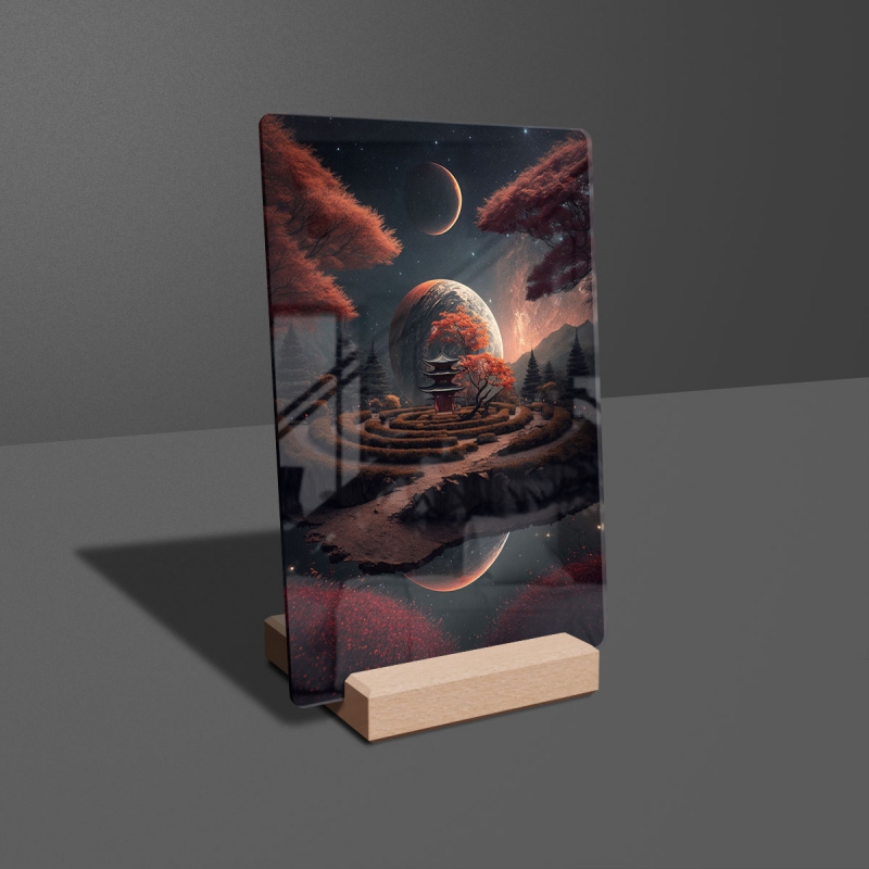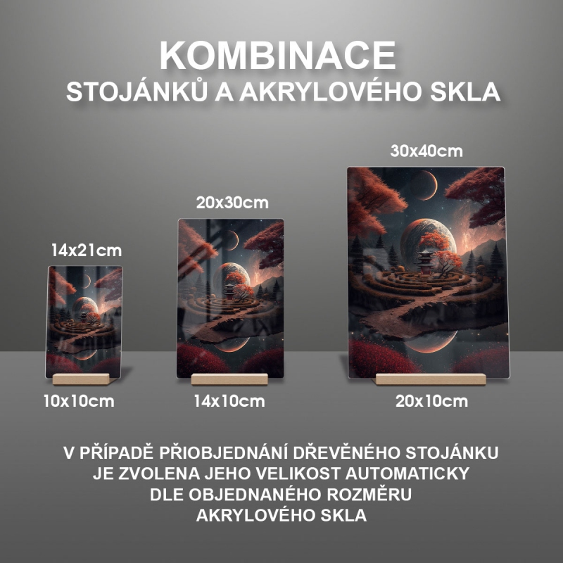 Na produktovém fotu vyobrazena nejoblíbenější varianta akrylového skla 14x21/21x14cm a dřevěný stojánek 10x10cm.