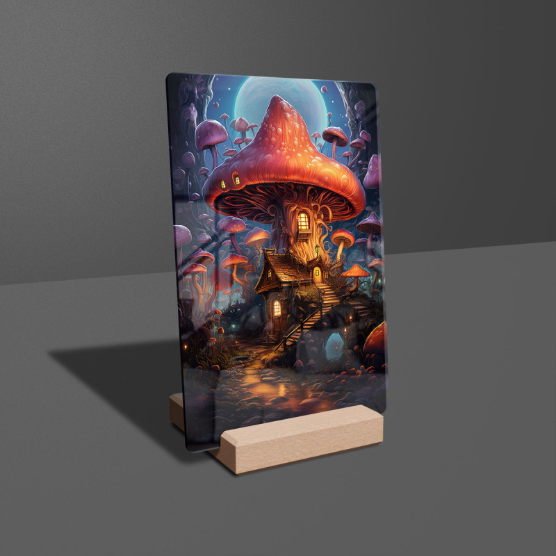 Na produktovém fotu vyobrazena nejoblíbenější varianta akrylového skla 14x21/21x14cm a dřevěný stojánek 10x10cm.