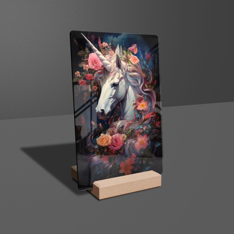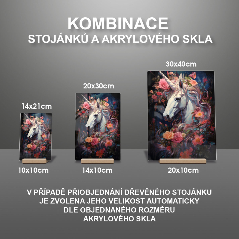 Na produktovém fotu vyobrazena nejoblíbenější varianta akrylového skla 14x21/21x14cm a dřevěný stojánek 10x10cm.