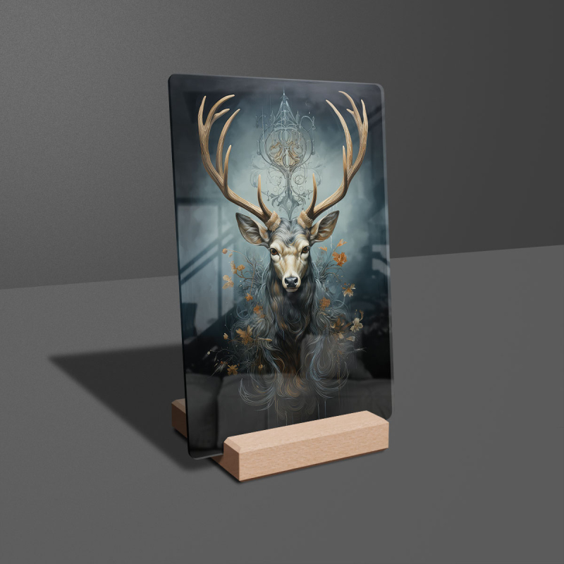 Na produktovém fotu vyobrazena nejoblíbenější varianta akrylového skla 14x21/21x14cm a dřevěný stojánek 10x10cm.