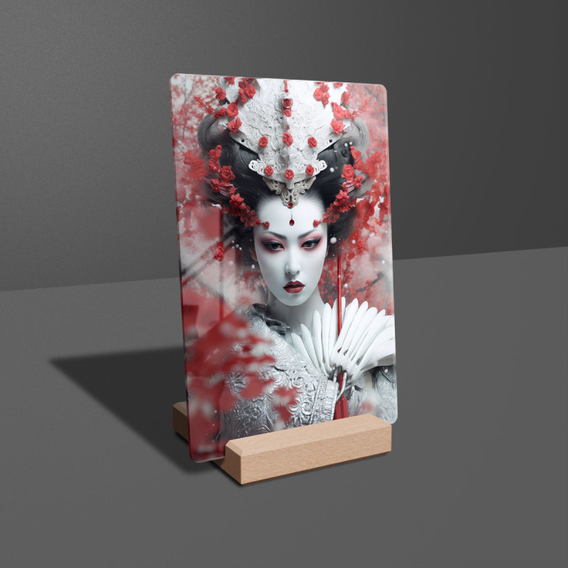Na produktovém fotu vyobrazena nejoblíbenější varianta akrylového skla 14x21/21x14cm a dřevěný stojánek 10x10cm.