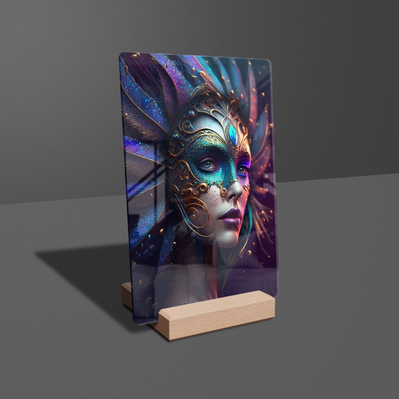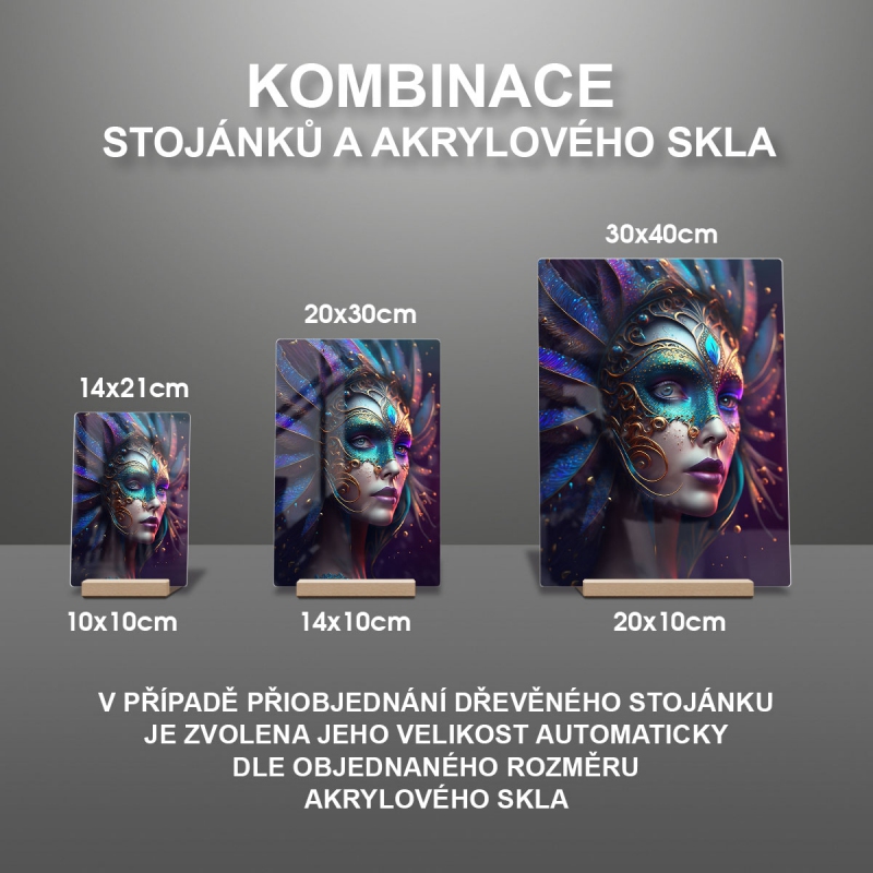 Na produktovém fotu vyobrazena nejoblíbenější varianta akrylového skla 14x21/21x14cm a dřevěný stojánek 10x10cm.