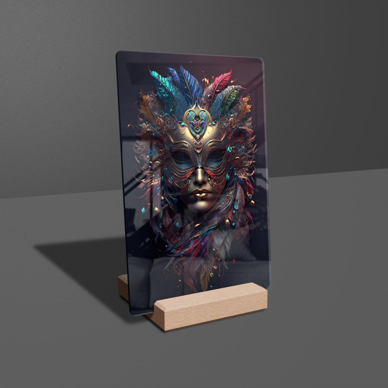 Na produktovém fotu vyobrazena nejoblíbenější varianta akrylového skla 14x21/21x14cm a dřevěný stojánek 10x10cm.