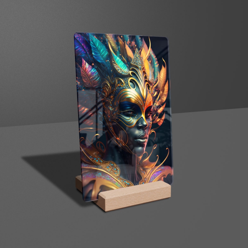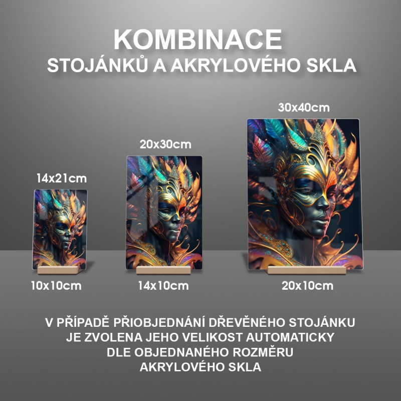 Na produktovém fotu vyobrazena nejoblíbenější varianta akrylového skla 14x21/21x14cm a dřevěný stojánek 10x10cm.