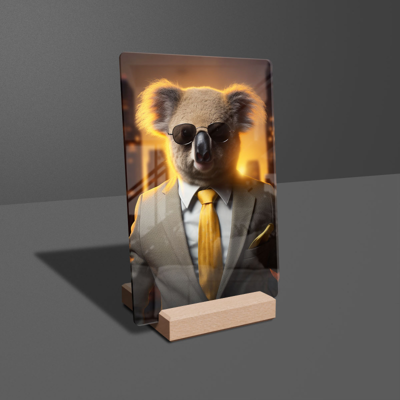 Na produktovém fotu vyobrazena nejoblíbenější varianta akrylového skla 14x21/21x14cm a dřevěný stojánek 10x10cm.