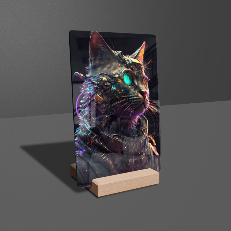 Na produktovém fotu vyobrazena nejoblíbenější varianta akrylového skla 14x21/21x14cm a dřevěný stojánek 10x10cm.