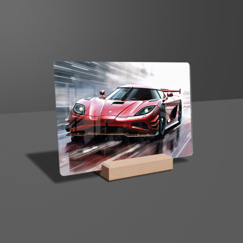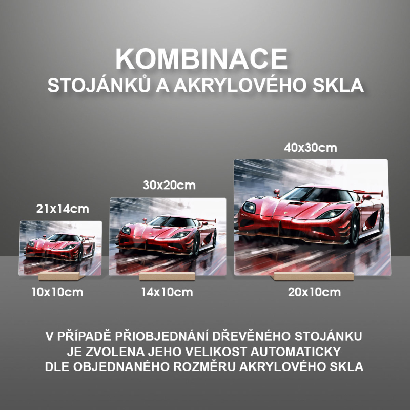 Na produktovém fotu vyobrazena nejoblíbenější varianta akrylového skla 14x21/21x14cm a dřevěný stojánek 10x10cm.