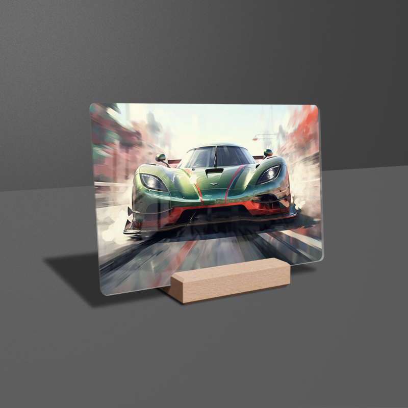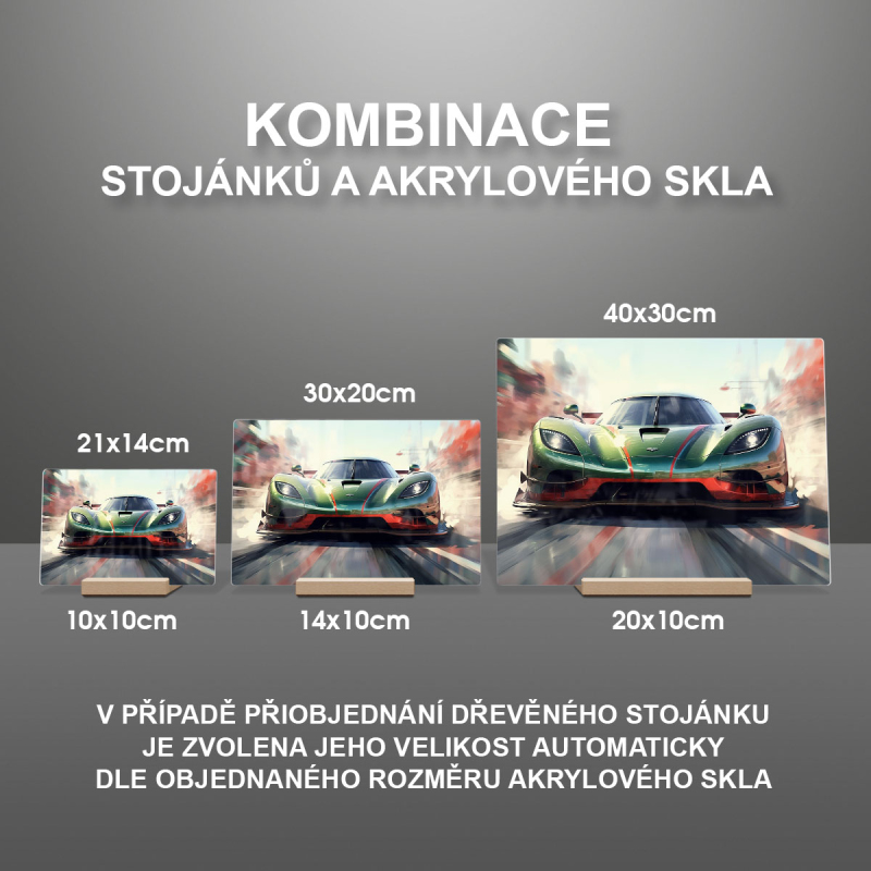 Na produktovém fotu vyobrazena nejoblíbenější varianta akrylového skla 14x21/21x14cm a dřevěný stojánek 10x10cm.