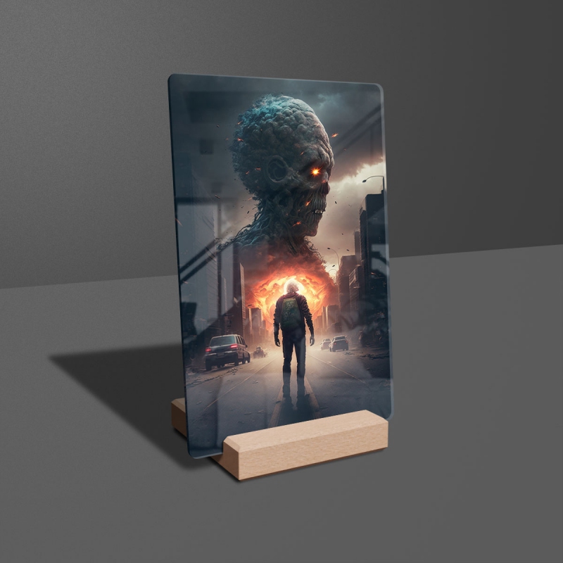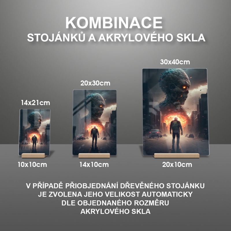Na produktovém fotu vyobrazena nejoblíbenější varianta akrylového skla 14x21/21x14cm a dřevěný stojánek 10x10cm.