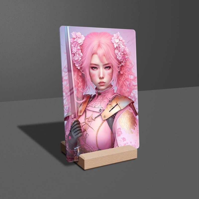 Na produktovém fotu vyobrazena nejoblíbenější varianta akrylového skla 14x21/21x14cm a dřevěný stojánek 10x10cm.