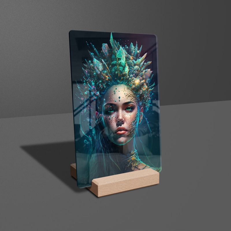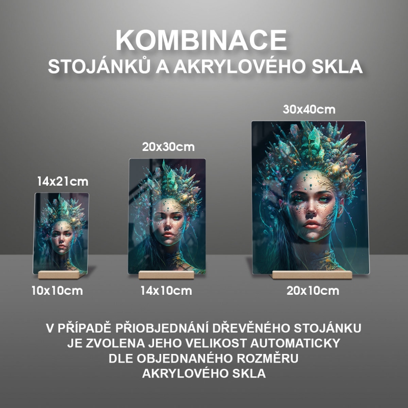 Na produktovém fotu vyobrazena nejoblíbenější varianta akrylového skla 14x21/21x14cm a dřevěný stojánek 10x10cm.