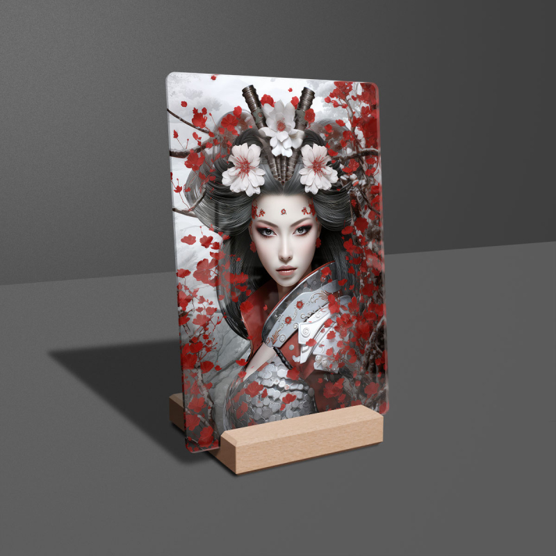 Na produktovém fotu vyobrazena nejoblíbenější varianta akrylového skla 14x21/21x14cm a dřevěný stojánek 10x10cm.