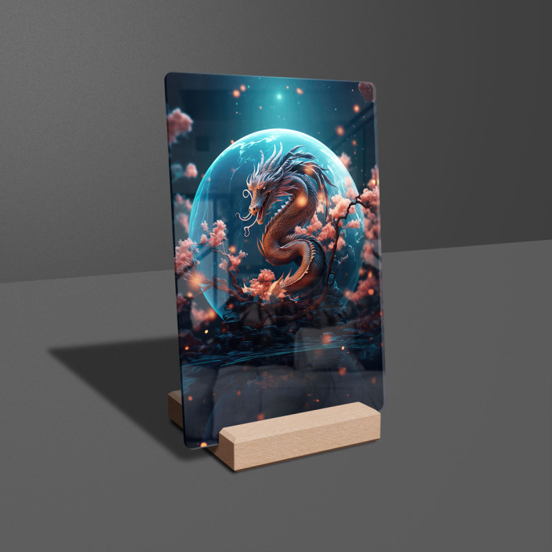 Na produktovém fotu vyobrazena nejoblíbenější varianta akrylového skla 14x21/21x14cm a dřevěný stojánek 10x10cm.