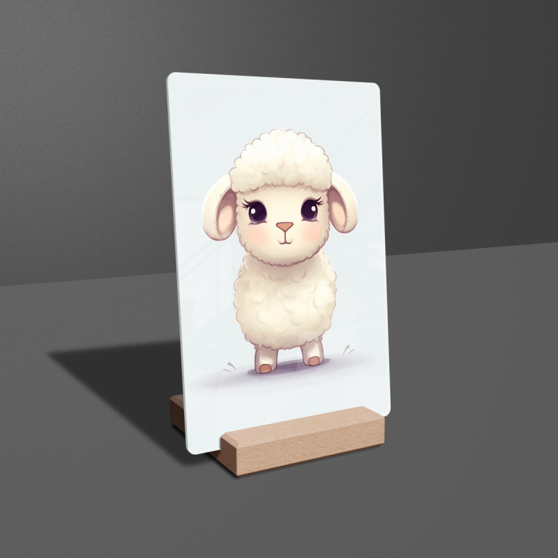Na produktovém fotu vyobrazena nejoblíbenější varianta akrylového skla 14x21/21x14cm a dřevěný stojánek 10x10cm.