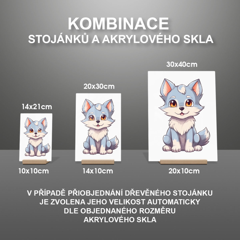 V případě přiobjednání dřevěného stojánku je zvolena jeho velikost automaticky dle objednaného rozměru akrylového skla viz produktové foto.
