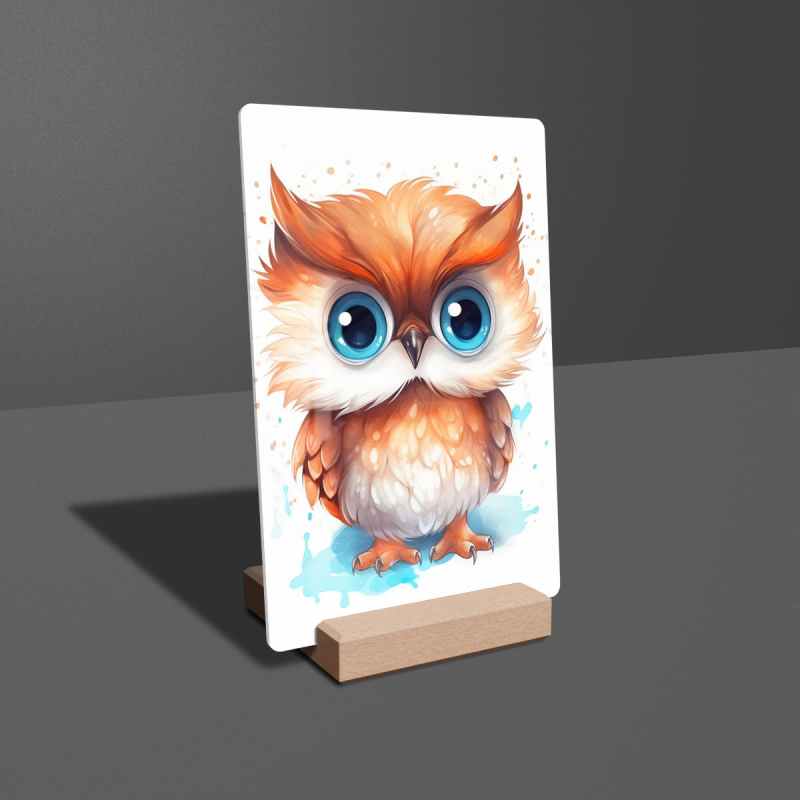 Na produktovém fotu vyobrazena nejoblíbenější varianta akrylového skla 14x21/21x14cm a dřevěný stojánek 10x10cm.