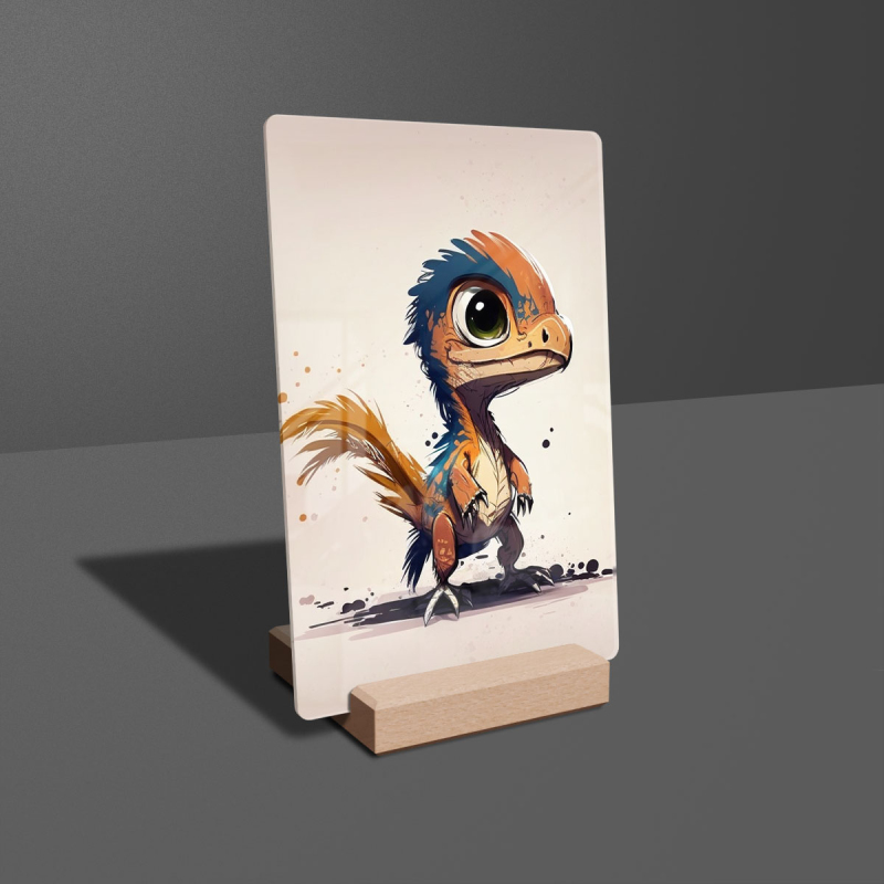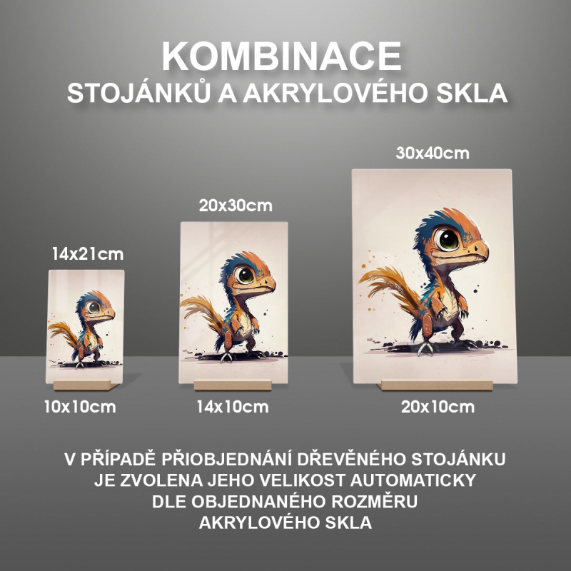 Na produktovém fotu vyobrazena nejoblíbenější varianta akrylového skla 14x21/21x14cm a dřevěný stojánek 10x10cm.
