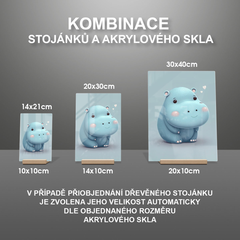 Na produktovém fotu vyobrazena nejoblíbenější varianta akrylového skla 14x21/21x14cm a dřevěný stojánek 10x10cm.