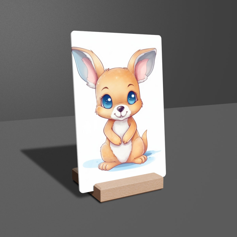 Na produktovém fotu vyobrazena nejoblíbenější varianta akrylového skla 14x21/21x14cm a dřevěný stojánek 10x10cm.