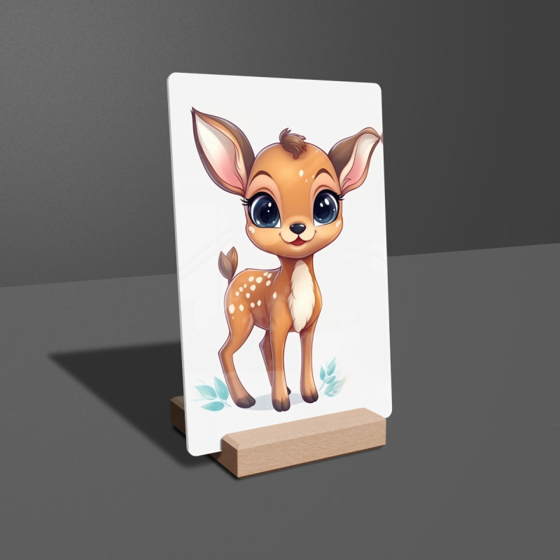 Na produktovém fotu vyobrazena nejoblíbenější varianta akrylového skla 14x21/21x14cm a dřevěný stojánek 10x10cm.